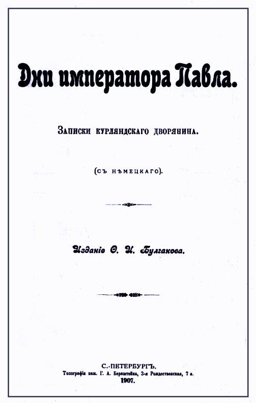 В 1886 г. в Лейпциге появилась книга, изданная без обозначения имени автора и носившая заглавие: «Aus den Tagen Kaiser Pauls». Близким знакомством с двором, живым изложением, наконец, обилием мелких подробностей, иногда дающих событиям кратковременного царствования Павла совершенно новое освещение, книга эта привлекла к себе внимание историков-специалистов. Но для обыкновенного читателя она была до последнего времени совершенно недоступна. Содержа рассказ о последних часах императора Павла, она, конечно, подверглась запрещению в России. Перевести ее до 17 октября 1906 года было немыслимо, а ссылаться на нее можно было глухо, безыменно.Теперь мы имеем возможность предложить вниманию читателя любопытные записки с незначительными сокращениями, касающимися некоторых мелких и неинтересных подробностей. Можем и снять таинственную завесу с их автора и назовем его настоящим именем. Это — барон Карл Генрих Гейкинг.Издание 1907 года, приведено к современной орфографии.