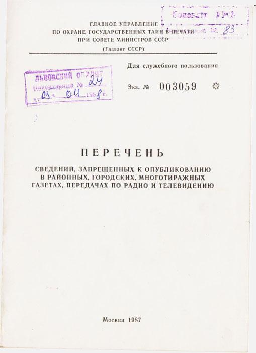 Перечень сведений, запрещенных к опубликованию в районных, городских, многотиражных газетах, передачах по радио и телевидению 1987 г.