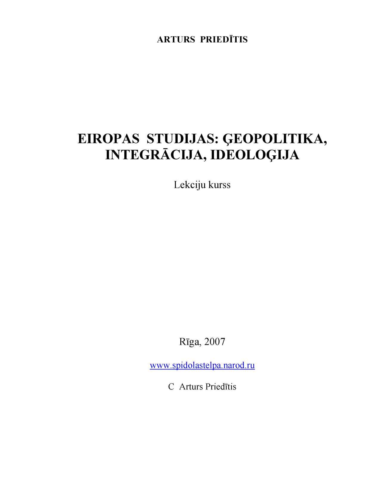 Arturs PrieditisEIROPAS STUDIJAS: ĢEOPOLITIKA, INTEGRĀCIJA, IDEOLOĢIJALekciju kurssRīga, 2007 www.spidolastelpa.narod.ru