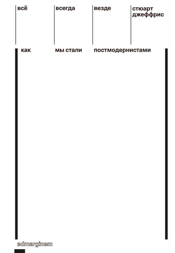 Стюарт Джеффрис, британский публицист, колумнист Guardian, автор нескольких книг, среди которых опубликованная «Ад Маргинем Пресс» по-русски «Гранд-отель „Бездна“: биография Франкфуртской школы», на сей раз предлагает читателям панорамный или, скорее, калейдоскопичный обзор полувековой на сегодняшний день истории постмодерн(изм)а — то ли культурной парадигмы, то ли стиля, то ли состояния, спутавшего карты приверженцам линейных исторических нарративов и смешавшего, кажется, всё и вся: высокое и низкое, старое и новое, правду и вымысел, искусство и поп-культуру и т. д.Среди героев книги — философы, политики, художники, стартаперы, кинорежиссеры, архитекторы, музыканты и активисты, представители всех сфер культурного (и только ли?) производства, внесшие свой вклад в «великое стирание границ», которое поставило под вопрос всякие иерархии (вместо них теперь — всё), временные рубежи (всё теперь всегда) и собственно границы (всё — везде). Джеффрис, в свою очередь, постмодернистски ставит под вопрос сам постмодернизм, показывая, что заложенный в него неолиберальным капитализмом эмансипаторный заряд не сработал, но в то же время признает, что коль скоро мы стали постмодернистами, у нас нет пути назад.