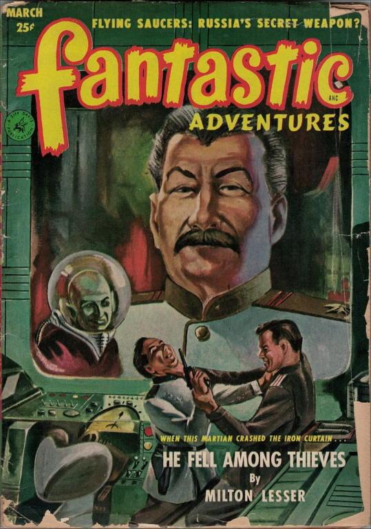 FLYING SAUCERS: RUSSIA’S SECRET WEAPON?WHEN THIS MARTIAN CRASHED THE IRON CURTAIN… HE FELL AMONG THIEVESIt was a bad break. America’s worst enemy became partners with a powerful planet. But Pearl Harbor was a catastrophe too, and remember what we did about that….