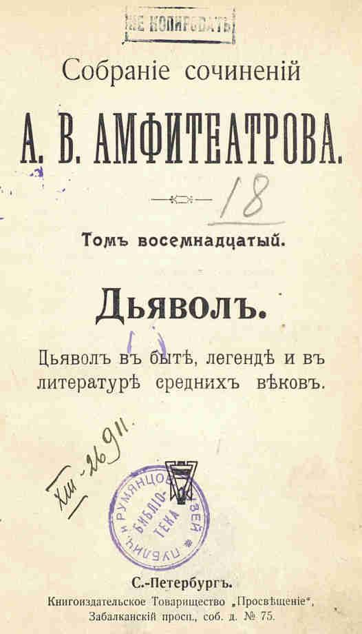 Исследование «Дьявол в быту, легендах и литературе Средних веков» стоит особняком в творчестве популярнейшего писателя Серебряного века Александра Амфитеатрова (1862–1938). Оттолкнувшись от книги итальянского профессора Артуро Графа «Дьявол», который сосредоточился на теологической литературе, Амфитеатров пошел значительно дальше своего первоисточника. Он сделал попытку изучить жизнь дьявола в человеческом сознании на всем культурном пространстве Средних веков — с того момента, как на заре христианства сложилась подробная его биография, до дней, когда идея, дававшая ему жизнь, почти изжила себя. Блестящая эрудиция позволила Амфитеатрову привлечь не только западные, но и русские источники, использовать мифологию и т. п. Он излагает родословие Сатаны, рассказывает о его физиологии и психологии, описывает дьявольские искушения, козни и наваждения, касается тонкостей бесовской магии, предоставляет слово побывавшим в аду очевидцам и приводит подробности борьбы с дьяволом духовенства.