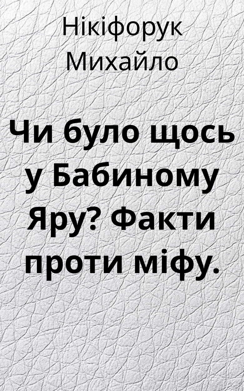 Використовуючи аерофотознімки і газети воєнного часу, український письменник Михайло Нікіфорук піддає сумніву міф про військові злодіяння у Бабиному Яру. Пам'ять про "різанину" євреїв в Бабиному Яру є болючою для всіх політиків. Але існує безліч доказів того, що вона ніколи не траплялася. Повітряна розвідка та фотографії, зроблені до і під час Другої світової війни, показують масові поховання жертв радянської ЧК/НКВД, але відсутні масові поховання євреїв.Михайло Нікіфорук — Голова Дослідницького комітету Бабиного Яру.Звіт комітету був вперше опублікований у 1991 році Ukraіnіan Frіends of Faіrfіeld Assocіatіon, 25 Thіrd Street, Stamford, Connectіcut 06905.