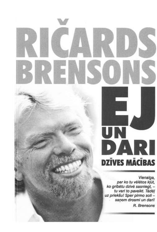 Ričards Brensons Ej un dariMiljardieris, piedzīvojumu meklētājs, cīnītājs, optimists, kompānijas “Virgin” un Nekeras salas īpašnieks, pasaules apceļotājs, arī Latvijā pazīstamā šova “Miljardu mantinieki” autors Ričards Brensons nekad nesaka – es nevaru, bet vienmēr mēģina paveikt šķietami neiespējamo. Grāmatā R.Brensons iepazīstina ar savu pieredzi, uzsākot un attīstot biznesu, un pierāda, ka ikviens var dzīvē sasniegt to, ko ļoti vēlas. Viņa dzīves stāsts ir apliecinājums uzņēmībai, neatlaidībai un drosmei un vienlaikus iedrošina ikvienu īstenot vispārdrošākos sapņus.No angļu valodas tulkojusi Irēna BirzvalkaDzīves mācībaMākslinieks Aigars Truhins Redaktore Zane SeņkovaSATURSIevads………………………………………………………………………. 41. Saņem drosmi un dari!………………………………………………. 62. Priecājies!…………………………………………………………….. 143. Esi drosmīgs!……………………………………………………….. -254. Izaicini sevi!…………………………………………………………. 345. Stāvi stingri uz kājām!…………………………………………….. 426. Izbaudi katru mirkli!……………………………………………….. 477. Augstu vērtē ģimeni un draugus!………………………………… 548. Respektē citus cilvēkus!…………………………………………… 639. Dari labu!…………………………………………………………….. 69Epilogs…………………………………………………………………… 79Rādītājs……………………………………………………………………. 82