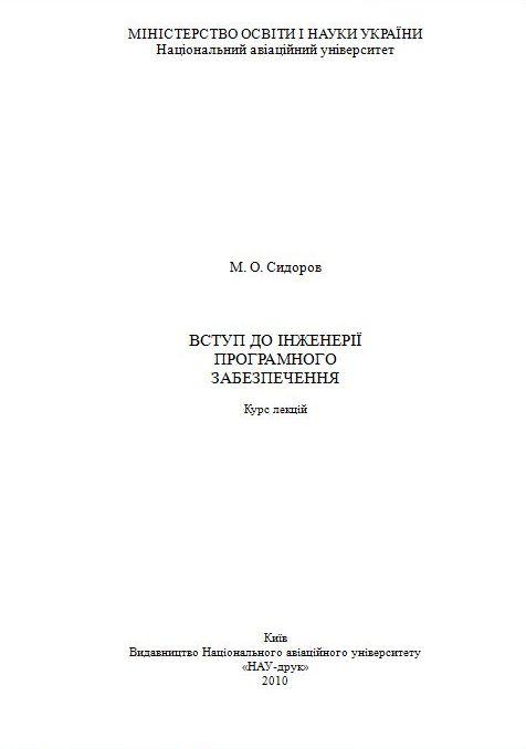 МІНІСТЕРСТВО ОСВІТИ І НАУКИ УКРАЇНИ Національний авіаційний університетМ. О. СидоровВСТУП ДО ІНЖЕНЕРІЇ ПРОГРАМНОГО ЗАБЕЗПЕЧЕННЯКурс лекцій КиївВидавництво Національного авіаційного університету «НАУ-друк» 2010УДК 004.4(042.4) ББК з 973.20-018.2я7 С 347Рецензент: S. А. Резніченко- канд.фіз.-мат.наук (Інститут програмних систем HAH України); В, А. Дерецький - канд.фіз.-мат.наук (Інститут програмних систем HAH України); В. А. Хоменко - канд.техн. наук, доц. (Національний авіаційний університет)Затверджено методично-редакційною радою Національного авіаційного університету (протокол № 14 від 03.07.2008p.).Сидоров М. О.С 347 Вступ до інженерії програмного забезпечення : курс лекцій / М.О.Сидоров. - К.: Вид-во Нац. авіац. ун-ту «НАУ-друк», 2010. -112 с.ISBN 978-966-598-626-3У курсі лекцій викладено основні положення інженерії програмного забезпечення.Для студентів напряму 6.050103 "Програмна інженерія".УДК 004.4(042.4) ББК з 973.20-018.2я7ISBN 978-966-598-266-3 © Сидоров М.О.. 2010