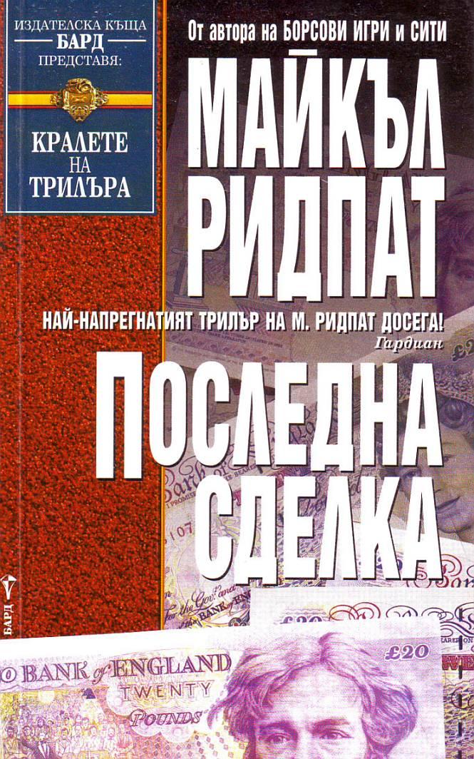 С двата си зашеметяващи романа „Борсови игри“ и „Борсов посредник“ Майкъл Ридпат завзе издателския свят с щурм. В класическа дъждовна лондонска вечер от Темза е изваден труп на млада жена. Няма причини, няма мотиви. Има само много чужди пари и прекомерно много засегнати интереси. Прочетете тази книга и ще разберете кой и как управлява парите ви. На 32 години Майкъл Ридпат вече е признат за английския Джон Гришам. Работил е като дилър в Лондонското Сити. Вещ познавач на финансовата система. Сега е сътрудник в инвестиционна фирма. |