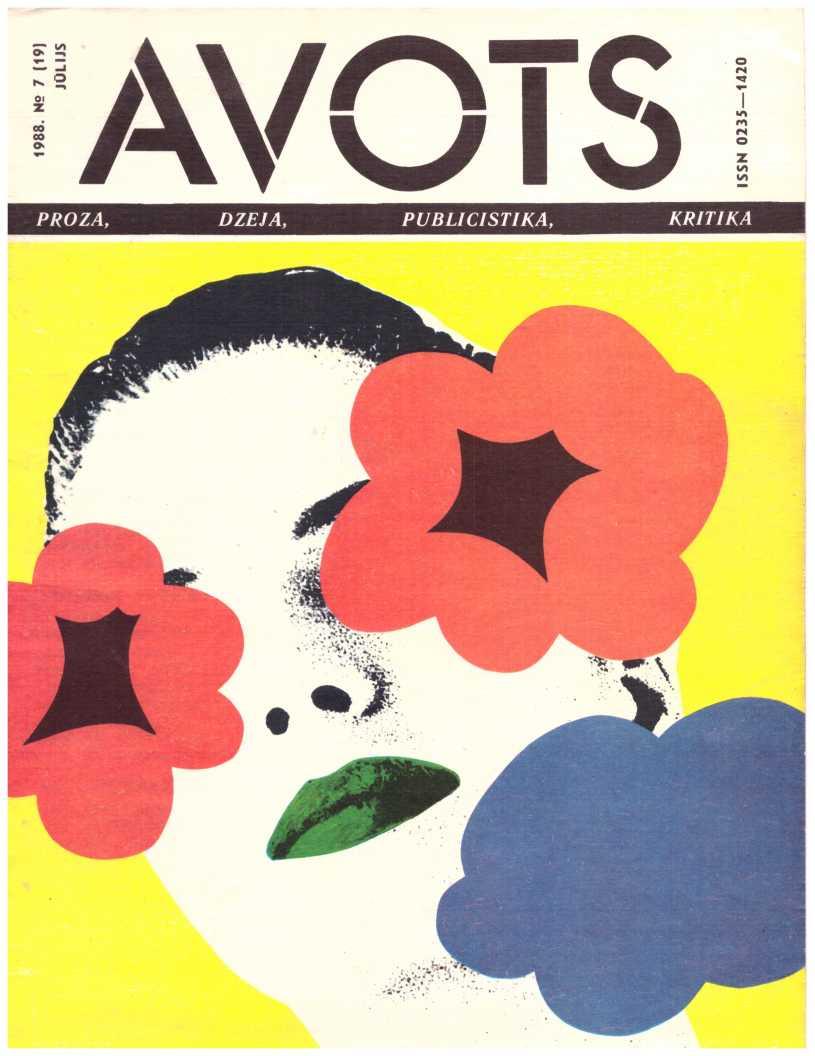 Avots 1989.07Latvijas ĻKJS Centrālas Komitejas un Latvijas PSR Rakstnieku Savienības literāri māksliniecisks un sabiedriski politisks žurnals jaunatnei. Iznāk kopš 1987. g. reizi menesī. Izdod Latvijas KP CK izdevniecība Rīca.failu izveidojis Imants Ločmelis imantslochmelis@inbox.lvRedakcijas Kolēģija:Aivars Kļavis (Galvenais Redaktors), Jānis Āboltiņš, Vilnis Bīriņš (Atbildīgais sekretārs), Ilmārs Blumbergs, Guntars Godiņš (Nodaļas redaktors), Māris Grīnblats, Edvīns Inkens, Vladimirs Kaņivecs (Galvenā redaktora vietnieks), Aleksandrs Kazakovs, Pēteris Krilovs, Juris Kronbergs, Jānis Peters, Baiba Stašāne, Ādolfs Šapiro, Viesturs Vecgrāvis, Imants Zemzaris. Redaktori: Jekaterina Borščova, Rudīte Kalpiņa, Jeļena Ļisicina, Normunds Naumanis, Eva Rubene. Dzejas konsultante Amanda Aizpuriete. Prozas konsultants Aivars Tarvids. Korektore Mārīte Pupiņa. Tulkotāja Anta Skorova. Mākslinieciskā redaktore Sarmīte Māliņa. Tehniskā redaktore Ināra Jurjāne.Manuskriptus pieņem divos eksemplāros mašīnrakstā, nerecenzē un atpakaļ neizsniedz.Литературно-ХудожественныйиОбщественно-Политический журнал для молодежи «Авотс» («Родник»| На латышском и русском языках. Издание Цк Лксм Латвии И Союза Писателей Латвийской ССР. Издательство Цк Кп Латвии, Рига. Адрес Редакции: Рига, Баласта Дам-Бис, 3. Отпечатано В Типографии Издательства Цк Кп Латвии, 226081, Г. Рига, Баласта Дамбис, 5. Издается С 1987 Года Раз В Месяц.Nodots Salikšanai 5.09.89. Parakstīts Iespiešanai 13.06.89. Jt 00136. Formāts 60x9018. Ofseta Papīrs Nr. 1., 2. Ofseta Tehnika. 10+0,5 Uzsk. Iespiedl., 21,5 Uzsk. Krasu Novilk., 14,7 Izdevn. L. Metiens 143 000 (Latviešu Valoda — 100 000, Krievu Valoda — 43 000). Pasūt. Nr. 874. Maksa 50 Кар. Redakcijas Adrese: Pasta Indekss 226081, Rīga, Balasta Dambī 3. Abonementa Kastīte 35. Telefoni: Galv. Red. 224166; Galv. Red. Vietn. 224100; Atb. Sekretāram Un Tehn. Redaktorei 225654; Publicistikas Nod. Vad. 229631; Kultūras Nod. Vad., Makslin. Red. 210030; Dzejas Un Prozas Nod. Vad., Konsultantiem 227208. Iespiests Lkp Ck Izdevniecības Tipogrāfija, 226081, Rīgā, Balasta Dambī 3.