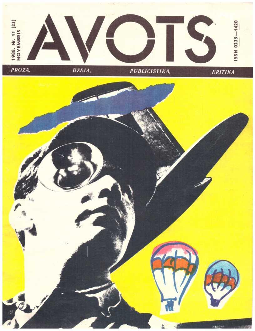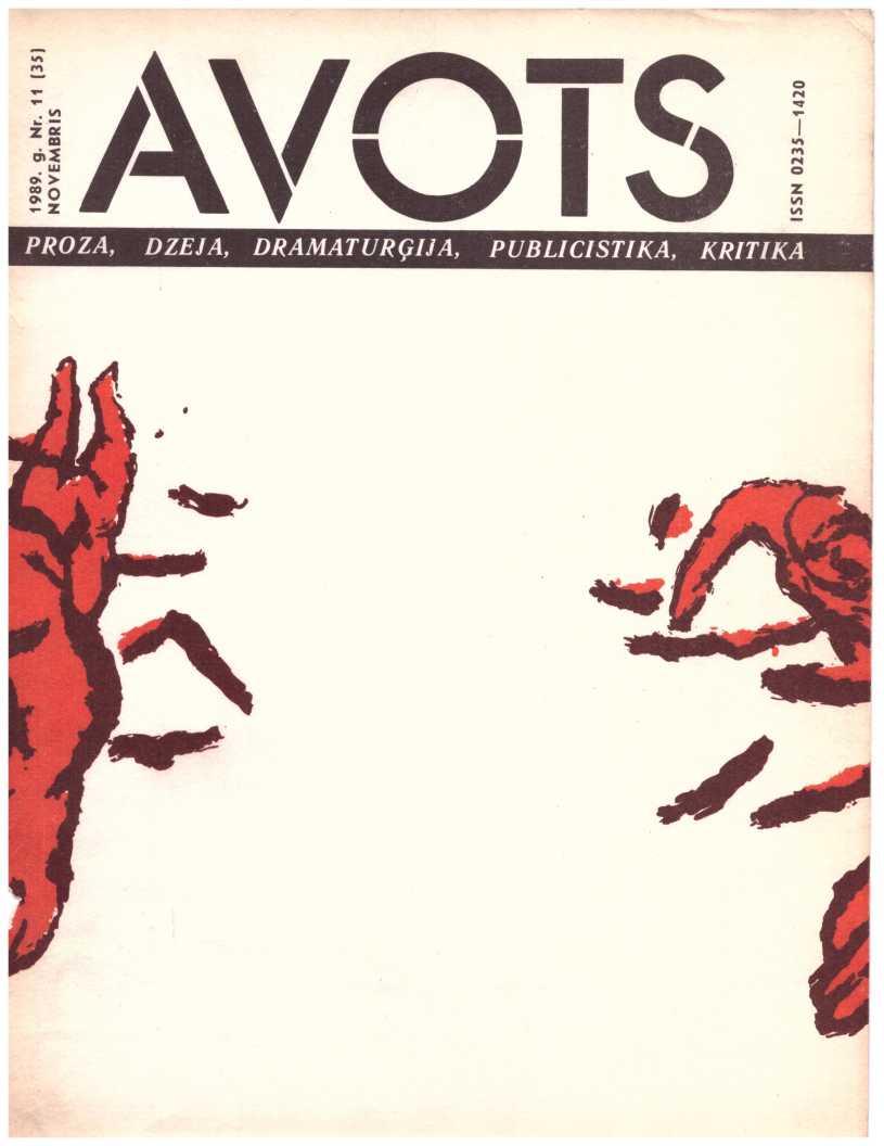 Avots 1989.11Latvijas ĻKJS Centrālas Komitejas un Latvijas PSR Rakstnieku Savienības literāri māksliniecisks un sabiedriski politisks žurnals jaunatnei. Iznāk kopš 1987. g. reizi menesī. Izdod Latvijas KP CK izdevniecība Rīca.failu izveidojis Imants Ločmelis imantslochmelis@inbox.lvRedakcijas Kolēģija:Aivars Kļavis (Galvenais Redaktors), Jānis Āboltiņš, Vilnis Bīriņš (Atbildīgais sekretārs), Ilmārs Blumbergs, Guntars Godiņš (Nodaļas redaktors), Māris Grīnblats, Edvīns Inkens, Vladimirs Kaņivecs (Galvenā redaktora vietnieks), Aleksandrs Kazakovs, Pēteris Krilovs, Juris Kronbergs, Jānis Peters, Baiba Stašāne, Ādolfs Šapiro, Viesturs Vecgrāvis, Imants Zemzaris. Redaktori: Jekaterina Borsčova, Rudīte Kalpiņa, Jeļena Ļisicina, Normunds Naumanis, Eva Rubene. Dzejas konsultante Amanda Aizpuriete. Prozas konsultants Aivars Tarvids. Korektore Mārīte Pupiņa. Tulkotāja Anta Skorova. Mākslinieciskā redaktore Sarmīte Māliņa. Tehniskā redaktore Ināra Jurjāne.Manuskriptus pieņem divos eksemplāros mašīnrakstā, nerecenzē un atpakaļ neizsniedz.Литературно-ХудожественныйиОбщественно-Политический журнал для молодежи «Авотс» («Родник»| На латышском и русском языках. Издание Цк Лксм Латвии И Союза Писателей Латвийской ССР. Издательство Цк Кп Латвии, Рига. Адрес Редакции: Рига, Баласта Дам-Бис, 3. Отпечатано В Типографии Издательства Цк Кп Латвии, 226081, Г. Рига, Баласта Дамбис, 5. Издается С 1987 Года Раз В Месяц.Nodots Salikšanai 5.09.89. Parakstīts Iespiešanai 13.06.89. Jt 00136. Formāts 60x9018. Ofseta Papīrs Nr. 1., 2. Ofseta Tehnika. 10+0,5 Uzsk. Iespiedl., 21,5 Uzsk. Krasu Novilk., 14,7 Izdevn. L. Metiens 143 000 (Latviešu Valoda — 100 000, Krievu Valoda — 43 000). Pasūt. Nr. 874. Maksa 50 Кар. Redakcijas Adrese: Pasta Indekss 226081, Rīga, Balasta Dambī 3. Abonementa Kastīte 35. Telefoni: Galv. Red. 224166; Galv. Red. Vietn. 224100; Atb. Sekretāram Un Tehn. Redaktorei 225654; Publicistikas Nod. Vad. 229631; Kultūras Nod. Vad., Makslin. Red. 210030; Dzejas Un Prozas Nod. Vad., Konsultantiem 227208. Iespiests Lkp Ck Izdevniecības Tipogrāfija, 226081, Rīgā, Balasta Dambī 3.