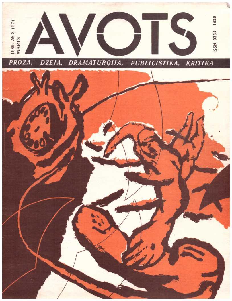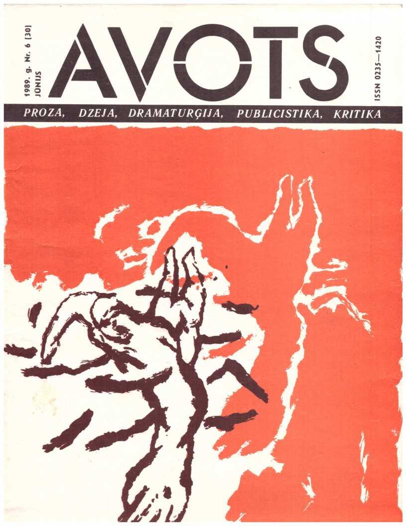 Avots 1989.06Latvijas LKJS Centrālās Komitejas un Latvijas PSR rakstnieku savienības literāri māksliniecisks un sabiedriski politisks žurnals jaunatnei. Iznāk kops 1987. g. reizi mēnesī. Izdod Latvijas KP CK izdevniecība Rīga.failu izveidojis Imants Ločmelis imantslochmelis@inbox.lvManuskriptus pieņem divos eksemplāros mašīnrakstā, nerecenzē un atpakaļ neizsniedz.Литературно-художественный и общественно-политический журнал для молодежи «авотс» («родник») на латышском и русском языках. Издание цк лксм латвии и союза писателей латвийской сср. Издательство цк кп латвии, рига. Адрес редакции: рига, баласта дам бис, 3. Отпечатано в типографии издательства цк кп латвии, 226081, г. Рига, баласта дамбис, 3. Издается с 1987 года раз в месяц.Nodots salikšanai 6.04.89. Parakstīts iespiešanai 15.05.89. Jt 00131. Formāts 60x90/8. Ofseta papīrs nr. 1., 2. Ofseta tehnika. 10 + 0,5 uzsk. Iespiedi., 21,5 uzsk. Krasu novilk., 14,6 izdevn. L. Metiens 143 000 (latviešu valodā — 100 000, krievu valodā — 43 000). Pasot. Nr. 565. Maksā 50 кар. Redakcijas adrese: pasta indekss 226081, rīgā, balasta dambī 3. Abonementa kastīte 35. Telefoni: galv. Red. 224166; galv. Red. Vietn. 224100; atb. Sekretāram un tehn. Redaktorei 225654; publicistikas nod. Vad. 229631; kultūras nod. Vad., mākslin. Red. 210030; dzejas un prozas nod. Vad., konsultantiem 227208. Iespiests lkp ck izdevniecības tipogrāfijā. 226081, rīgā, balasta dambī 3.