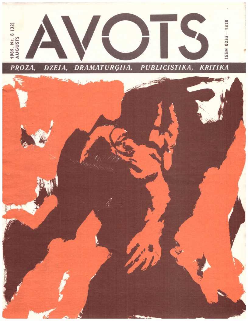Avots 1989.08Latvijas ĻKJS Centrālas Komitejas un Latvijas PSR Rakstnieku Savienības literāri māksliniecisks un sabiedriski politisks žurnals jaunatnei. Iznāk kopš 1987. g. reizi menesī. Izdod Latvijas KP CK izdevniecība Rīca.failu izveidojis Imants Ločmelis imantslochmelis@inbox.lvRedakcijas Kolēģija:Aivars Kļavis (Galvenais Redaktors), Jānis Āboltiņš, Vilnis Bīriņš (Atbildīgais sekretārs), Ilmārs Blumbergs, Guntars Godiņš (Nodaļas redaktors), Māris Grīnblats, Edvīns Inkens, Vladimirs Kaņivecs (Galvenā redaktora vietnieks), Aleksandrs Kazakovs, Pēteris Krilovs, Juris Kronbergs, Jānis Peters, Baiba Stašāne, Ādolfs Šapiro, Viesturs Vecgrāvis, Imants Zemzaris. Redaktori: Jekaterina Borsčova, Rudīte Kalpiņa, Jeļena Ļisicina, Normunds Naumanis, Eva Rubene. Dzejas konsultante Amanda Aizpuriete. Prozas konsultants Aivars Tarvids. Korektore Mārīte Pupiņa. Tulkotāja Anta Skorova. Mākslinieciskā redaktore Sarmīte Māliņa. Tehniskā redaktore Ināra Jurjāne.Manuskriptus pieņem divos eksemplāros mašīnrakstā, nerecenzē un atpakaļ neizsniedz.Литературно-ХудожественныйиОбщественно-Политический журнал для молодежи «Авотс» («Родник»| На латышском и русском языках. Издание Цк Лксм Латвии И Союза Писателей Латвийской ССР. Издательство Цк Кп Латвии, Рига. Адрес Редакции: Рига, Баласта Дам-Бис, 3. Отпечатано В Типографии Издательства Цк Кп Латвии, 226081, Г. Рига, Баласта Дамбис, 5. Издается С 1987 Года Раз В Месяц.Nodots Salikšanai 5.09.89. Parakstīts Iespiešanai 13.06.89. Jt 00136. Formāts 60x9018. Ofseta Papīrs Nr. 1., 2. Ofseta Tehnika. 10+0,5 Uzsk. Iespiedl., 21,5 Uzsk. Krasu Novilk., 14,7 Izdevn. L. Metiens 143 000 (Latviešu Valoda — 100 000, Krievu Valoda — 43 000). Pasūt. Nr. 874. Maksa 50 Кар. Redakcijas Adrese: Pasta Indekss 226081, Rīga, Balasta Dambī 3. Abonementa Kastīte 35. Telefoni: Galv. Red. 224166; Galv. Red. Vietn. 224100; Atb. Sekretāram Un Tehn. Redaktorei 225654; Publicistikas Nod. Vad. 229631; Kultūras Nod. Vad., Makslin. Red. 210030; Dzejas Un Prozas Nod. Vad., Konsultantiem 227208. Iespiests Lkp Ck Izdevniecības Tipogrāfija, 226081, Rīgā, Balasta Dambī 3.