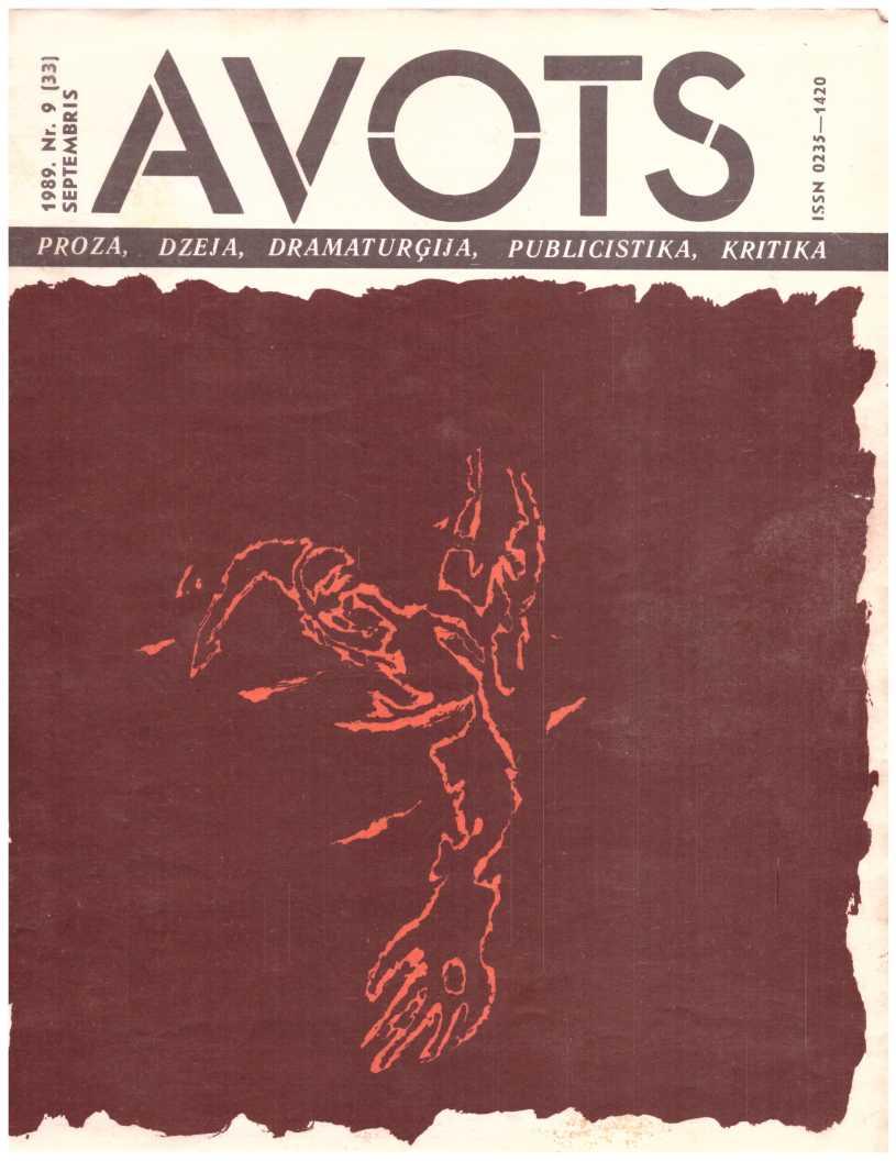 Avots 1989.09Latvijas ĻKJS Centrālas Komitejas un Latvijas PSR Rakstnieku Savienības literāri māksliniecisks un sabiedriski politisks žurnals jaunatnei. Iznāk kopš 1987. g. reizi menesī. Izdod Latvijas KP CK izdevniecība Rīca.failu izveidojis Imants Ločmelis imantslochmelis@inbox.lvRedakcijas Kolēģija:Aivars Kļavis (Galvenais Redaktors), Jānis Āboltiņš, Vilnis Bīriņš (Atbildīgais sekretārs), Ilmārs Blumbergs, Guntars Godiņš (Nodaļas redaktors), Māris Grīnblats, Edvīns Inkens, Vladimirs Kaņivecs (Galvenā redaktora vietnieks), Aleksandrs Kazakovs, Pēteris Krilovs, Juris Kronbergs, Jānis Peters, Baiba Stašāne, Ādolfs Šapiro, Viesturs Vecgrāvis, Imants Zemzaris. Redaktori: Jekaterina Borsčova, Rudīte Kalpiņa, Jeļena Ļisicina, Normunds Naumanis, Eva Rubene. Dzejas konsultante Amanda Aizpuriete. Prozas konsultants Aivars Tarvids. Korektore Mārīte Pupiņa. Tulkotāja Anta Skorova. Mākslinieciskā redaktore Sarmīte Māliņa. Tehniskā redaktore Ināra Jurjāne.Manuskriptus pieņem divos eksemplāros mašīnrakstā, nerecenzē un atpakaļ neizsniedz.Литературно-ХудожественныйиОбщественно-Политический журнал для молодежи «Авотс» («Родник»| На латышском и русском языках. Издание Цк Лксм Латвии И Союза Писателей Латвийской ССР. Издательство Цк Кп Латвии, Рига. Адрес Редакции: Рига, Баласта Дам-Бис, 3. Отпечатано В Типографии Издательства Цк Кп Латвии, 226081, Г. Рига, Баласта Дамбис, 5. Издается С 1987 Года Раз В Месяц.Nodots Salikšanai 5.09.89. Parakstīts Iespiešanai 13.06.89. Jt 00136. Formāts 60x9018. Ofseta Papīrs Nr. 1., 2. Ofseta Tehnika. 10+0,5 Uzsk. Iespiedl., 21,5 Uzsk. Krasu Novilk., 14,7 Izdevn. L. Metiens 143 000 (Latviešu Valoda — 100 000, Krievu Valoda — 43 000). Pasūt. Nr. 874. Maksa 50 Кар. Redakcijas Adrese: Pasta Indekss 226081, Rīga, Balasta Dambī 3. Abonementa Kastīte 35. Telefoni: Galv. Red. 224166; Galv. Red. Vietn. 224100; Atb. Sekretāram Un Tehn. Redaktorei 225654; Publicistikas Nod. Vad. 229631; Kultūras Nod. Vad., Makslin. Red. 210030; Dzejas Un Prozas Nod. Vad., Konsultantiem 227208. Iespiests Lkp Ck Izdevniecības Tipogrāfija, 226081, Rīgā, Balasta Dambī 3.