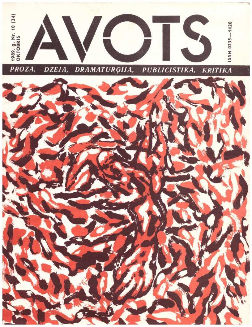 Avots 1989.10Latvijas ĻKJS Centrālas Komitejas un Latvijas PSR Rakstnieku Savienības literāri māksliniecisks un sabiedriski politisks žurnals jaunatnei. Iznāk kopš 1987. g. reizi menesī. Izdod Latvijas KP CK izdevniecība Rīca.failu izveidojis Imants Ločmelis imantslochmelis@inbox.lvRedakcijas Kolēģija:Aivars Kļavis (Galvenais Redaktors), Jānis Āboltiņš, Vilnis Bīriņš (Atbildīgais sekretārs), Ilmārs Blumbergs, Guntars Godiņš (Nodaļas redaktors), Māris Grīnblats, Edvīns Inkens, Vladimirs Kaņivecs (Galvenā redaktora vietnieks), Aleksandrs Kazakovs, Pēteris Krilovs, Juris Kronbergs, Jānis Peters, Baiba Stašāne, Ādolfs Šapiro, Viesturs Vecgrāvis, Imants Zemzaris. Redaktori: Jekaterina Borsčova, Rudīte Kalpiņa, Jeļena Ļisicina, Normunds Naumanis, Eva Rubene. Dzejas konsultante Amanda Aizpuriete. Prozas konsultants Aivars Tarvids. Korektore Mārīte Pupiņa. Tulkotāja Anta Skorova. Mākslinieciskā redaktore Sarmīte Māliņa. Tehniskā redaktore Ināra Jurjāne.Manuskriptus pieņem divos eksemplāros mašīnrakstā, nerecenzē un atpakaļ neizsniedz.Литературно-ХудожественныйиОбщественно-Политический журнал для молодежи «Авотс» («Родник»| На латышском и русском языках. Издание Цк Лксм Латвии И Союза Писателей Латвийской ССР. Издательство Цк Кп Латвии, Рига. Адрес Редакции: Рига, Баласта Дам-Бис, 3. Отпечатано В Типографии Издательства Цк Кп Латвии, 226081, Г. Рига, Баласта Дамбис, 5. Издается С 1987 Года Раз В Месяц.Nodots Salikšanai 5.09.89. Parakstīts Iespiešanai 13.06.89. Jt 00136. Formāts 60x9018. Ofseta Papīrs Nr. 1., 2. Ofseta Tehnika. 10+0,5 Uzsk. Iespiedl., 21,5 Uzsk. Krasu Novilk., 14,7 Izdevn. L. Metiens 143 000 (Latviešu Valoda — 100 000, Krievu Valoda — 43 000). Pasūt. Nr. 874. Maksa 50 Кар. Redakcijas Adrese: Pasta Indekss 226081, Rīga, Balasta Dambī 3. Abonementa Kastīte 35. Telefoni: Galv. Red. 224166; Galv. Red. Vietn. 224100; Atb. Sekretāram Un Tehn. Redaktorei 225654; Publicistikas Nod. Vad. 229631; Kultūras Nod. Vad., Makslin. Red. 210030; Dzejas Un Prozas Nod. Vad., Konsultantiem 227208. Iespiests Lkp Ck Izdevniecības Tipogrāfija, 226081, Rīgā, Balasta Dambī 3.